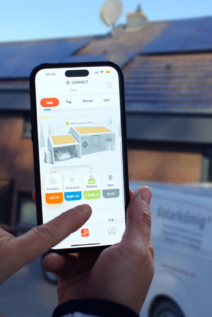 Wir integrieren Ihren Stromspeicher, die Photovoltaikanlage und Verbraucher in ein gemeinsames System – gesteuert über die Solarkönig Smart-Home Energiemanagement-App. Live-Daten zu Erzeugung, Verbrauch, Speicherstand und Netzbezug werden verständlich visualisiert. Sie können Geräte aus der Ferne schalten, Lasten priorisieren (z. B. Warmwasser, Speicher, Wallbox) und typische „Stromfresser“ identifizieren. So fließt möglichst viel Solarstrom direkt in Haushalt, Wärme und Mobilität.