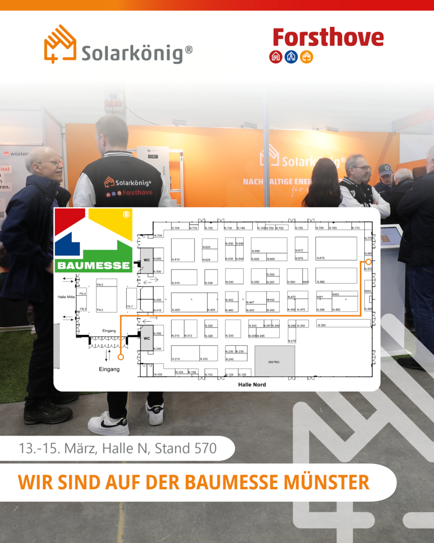 Vom 13. bis 15. März 2026 sind wir auf der Baumesse Münster vertreten. Sie finden uns in Halle Nord, Stand 570. Vor Ort informieren wir Sie umfassend über Photovoltaikanlagen, Stromspeicher, Wärmepumpen und Lösungen für die Elektromobilität. Unsere Experten zeigen Ihnen, wie sich verschiedene Technologien sinnvoll kombinieren lassen, um Ihr Zuhause effizienter und unabhängiger mit erneuerbarer Energie zu versorgen.
